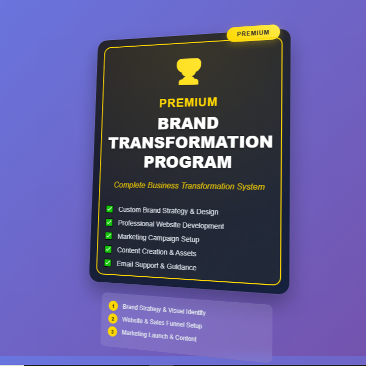 Transform your business with a professional brand identity and marketing system. The PREMIUM BRAND TRANSFORMATION PROGRAM delivers everything you need to build a powerful, cohesive brand from scratch—structured over a 90-day implementation schedule.